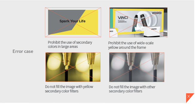 The main colors of VOOPOO are black gray and light gray. At the same time, in order to make the brand image unified and full ofchanges, and adapt to the needs of different scenes, "yellow" is specially selected as the embellishment, which is used in conjunction with the main color of the brand. When using spot color data, four-color data, and RGB data, it must be presented in accordance with standard color specifications. Under no circumstances can the colors .